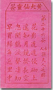 徐庶,三国时代一个杰出的政治家、军事家,与孔明是好朋友。本来,徐庶是有心辅佐刘备建立帝业的,但曹操却利用徐庶母亲来“打人质牌”,使徐庶改变初衷,返回家乡,落入曹操手中。徐庶离开刘备时,走马荐诸葛,极力推崇孔明。徐庶归家后,被徐母大骂他上了曹操的当。孝义两难存,徐庶在曹操手下做官,始终是“身在曹营心在汉”。此签是描述徐庶被曹操放假后,思念母亲,归家心切之情。