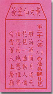 这又是一支与唐朝诗人白居易有关的签,不过,这是中平,而第廿四签是下下。区别是,廿四签失于孤单;这支则属中平,因为,总算有片刻的欢娱。白居易在浔阳江头夜送客,在船上听到悦耳的琵琶声,寻声访问,得见一失意女子,“同是天涯沦落人,相逢何必曾相识”,白居易有感于自己的落泊与琵琶女的遭遇,写成了著名的长诗《琵琶行》。这签中虽有快活,但极短暂,宜修身,忍守。