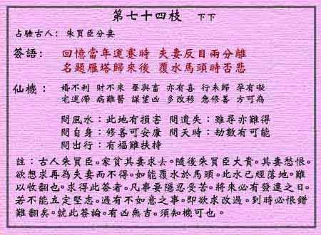 黄大仙灵签第七十四签:朱买臣分妻 (下下灵签)