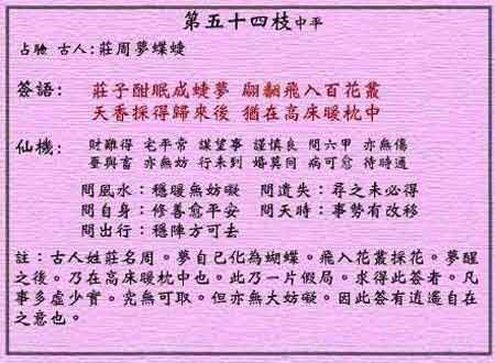 黄大仙灵签第五十四签:庄周梦蝶 (中平灵签)