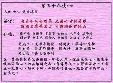 黄大仙灵签第三十九签:夷齐让国 (中吉灵签)