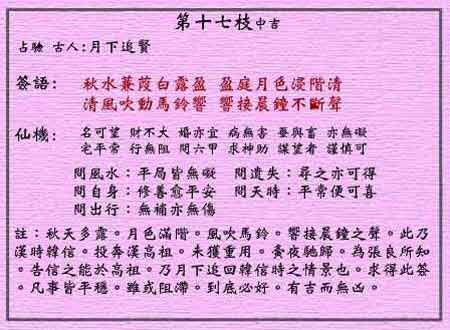 黄大仙灵签第十七签:月下追贤 (中吉灵签)