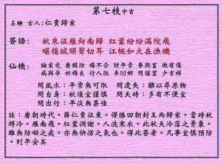 黄大仙灵签第七签:仁贵归家 (中吉灵签)