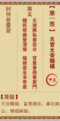 天道无私善恶分,官星普照善家门,赐民修德登清境,福禄寿全求帝君。