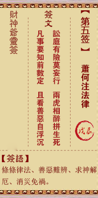 求得此签暗示目前福报不佳,问事求谋谨慎,岁君中道正气。钻研取巧玩弄必败。宜戒之。如果正好问诉讼,最好和解为要,否则官司到后来必吃亏。此签官员占之,切不可自恃权势。玩法弄法终招天谴。宜求神忏悔消灾解厄,见如不见闻如不闻。一切闲事休管,静处安身,官法自灭矣!。文人占之,功名未得时,学业渐进。商人占之,财利未遂,前途缓进,谋望待时。官司缠讼。合伙不吉。恐对薄公堂。应慎于始,终免后悔。艺人占之,。恋人占之,不是好预兆,故如非情投意合,要慎重考虑,以免误会而结合,因了解而分开,造成离婚诉讼的悲剧。病人占之,病情加重,老幼妇人危险宜消灾。