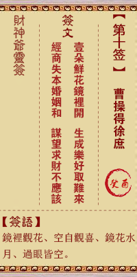 就像那中秋的明月,团圆光明,丹桂花开,结子在月中,可是此景如花在镜中,看有取无,一场虚望,就像那只闻楼梯响不见人下来令人空欢喜而已。三国时期曹操以巧计而夺得贤士徐庶。徐庶却终世不设一谋,以示"不位二主",虽得之,却只是折损人才。此签暗示若没有诚心正意的对人对事。纵使巧取豪夺到手,终也成空。为人处世须敬老尊贤。不可自恃权位。目无法纪,欺凌玩弄伦常。终不得善终。