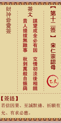 桂花飘香,月照满屋,这正是静观自得,自我反省的好时候,如果你相信有因果循环,就应多行善事,并烧好香来答谢上苍庇佑。此签中吉,凡事顺乎自然,一份耕耘,必有一份收获,一切谋望,只要尽力老实忠厚,自有贵人相助,神佛自然保佑,凡事皆可望逢凶化吉。此签引用宋仁宗行仁政,终得认其母,此乃种善因得善果之因果报应,此故事启示当事人,只要相信因果报应,行善积德,虔诚礼敬神佛。所求定有感应。