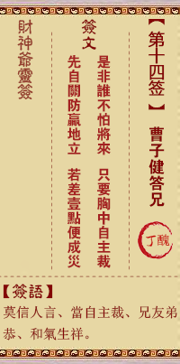 抽得此签暗示目前福报平平,问事求谋不可,只宜退守。委屈求全。凡事内安外宁。家和万事兴,家不和则万世穷。切莫听信谗言。自相斗争。此签官员占之,谨守份内之事,不可结党营私内斗须耗。将自食恶果。文人占之,多努力才有希望,运气会渐渐通顺。商人占之,内安外宁。财利,普通平常。艺人占之,不要得理不饶人,朋友兄弟有误会,尽快冰解有利。莫信小人言。恋人占之,不必急,缓进为宜。不可闹家庭革命。宜求神化解。病人占之,会渐渐痊愈,不必担心。