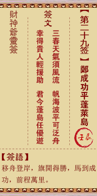 求得此签暗示目前福报圆满,问事求谋可期,有造福社会的天命。必须有领袖一方的大气。凡事要有慎谋能断广纳百川的胸襟。近贤人远小人。不可独断独行。时机成熟必可成为人上人。此签官员占之,大业可图,可领一方。善人神助,恶人神罚,宜戒慎之。文人占之,功名,学业,均可有成。商人占之,宜在夏期成功。财利占东方,春秋次之,冬季不吉。艺人占之,岁君亦佳,春日小吉,夏日大吉,秋日中吉,冬日不吉,须得时而进方有成,二八好行舟(外出远行),海面波平浪静,一帆风顺,至春末,谋望可通,夏日当空普照,大千世界任优游。恋人占之,二八运好,有情人终成眷属,爱河永浴,白头偕老。病人占之,渐渐痊愈。