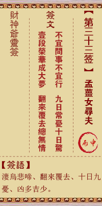 求得此签暗示目前福报不佳。问事求谋不可,也暗示有血光之灾。宜消灾。凡事谋为动则得咎。受冤委屈之辱在所难免。但无须忿忿不平。忍一时之气或可免除"血光之灾"。此签官员占之,虽有满腹才华,运未至不得志。莫强求。文人占之,功名落空,不必抱太大希望,学业跟不上。商人占之,现运欠通,守之安泰,待来春。艺人占之,有灾厄之忧,名利莫求,万事守旧,避难是非。宜防凶人中途侵害,凡事守旧。秋冬两季,要谨防意外,宜祷神息灾。恋人占之,不吉有分手之忧。婚成亦恐有"千里寻夫"(聚少别多)之苦,宜谨慎作抉择,可免抱憾。病人占之,有灾病险,男轻女深,宜消灾。
