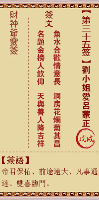 求得此签暗示目前福报圆满。问事求谋可成,好事成双。应积极把握。并感谢财神爷厚爱赐福。此签官员占之,得明官赏识提携。可成大器。文人占之,功名:显达得进,考试只要平时用功,必得金榜题名。商人占之,努力工作,财利自聚。凡事能心想事成。艺人占之,与财神爷先天有缘。可得厚爱赐福。喜事连连。凡事如意。恋人占之,天赐良缘。有情人终成眷属,当是好姻缘。病人占之,会渐渐痊愈。