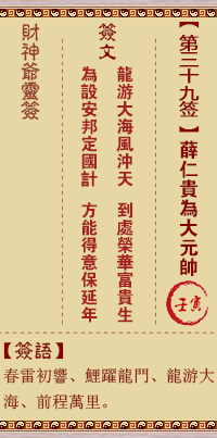 求得此签暗示目前福报平平。问事求谋难成,不遇时机及贵人徒劳无功,色取红白配合,物取鲤鸡龙之物,开运吉祥如意。此签官员占之,须有神佛或贵人相助,先难后得。谋望成功,前途远大,有贵人引荐,如鲤鱼跳出龙门,春天占问吉,冬则不利。文人占之,功名晚成,学业进步。商人占之,宜求神避凶。奔波劳碌,不得时遇贵终是无益,待来年春天,财利自顺。艺人占之,此签大吉,但若未遇时,且求神安闲守静,奔走南北,终是无益,待来年春月,方得名成立就,如枯木逢春。最宜取红鲤彩凤金龙为饰,红衣金鞋。金龙上天。大吉大利。恋人占之,婚姻占春,有神佛或贵人助力,双喜临门。六甲生男贵,生女得富。龙凤呈祥。病人占之,渐渐痊愈,至春平安。