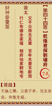 人生最快乐的,莫如天伦之乐;那就是一家老少,父慈子孝,兄友弟恭,经常嘻嘻哈哈,笑语频频情景。要有好儿孙,就要积德行善,要想风云际会,凡事顺利,那就要在明年的春天。此签启示。为人处世除了追求事业钱财之富贵功名外。还要有福享受"天伦之乐",才是真正的天下第一家。