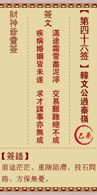 严冬飞雪,辛苦向前进,到了关外秦岭,更是一片白云茫茫,不知家在何处?蓝关积雪更深,使得马儿也踌躇不前。这首签诗,引用韩文公过秦岭的故事,表示你目前有个艰难的厄运,一方面要靠自己努力奋斗,以克服困难,一方面应多听取大师的开释或长辈及亲朋好友的意见,也许会碰到贵人帮助你打开困境。
