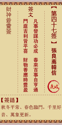 求得此签暗示目前福报俱足。问事求谋可期,即将鸿运高照。千里传来好音。可一展长才,出外可也衣锦荣归。此签官员占之,此签大吉,事事合宜,最利更动远行,只需奉公守法,平安自在。文人占之,岁君应春三月大吉,前途千里光明。很有希望,本身必须更充实实力,自然有志竟成。商人占之,有财利,合作可成。艺人占之,秋冬做事平平,逢春以来,谋事宜渐进,千里之处,名利可得,春夏皆吉利,有贵人,好似兄弟相助,万事亨通。恋人占之,得神助有情人终成眷属。病人占之,会转好。