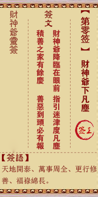 财神爷降临凡间来到你的眼前,帮你指引迷津并度化普罗大众。除了引渡善良的人登天成仙,皇天赋予察看人间善恶的任务,希望凡人多作善事必有善报,作恶的人会有恶报。俗云:积善之家必有余庆,积不善之家必有余殃。正是此签之意。