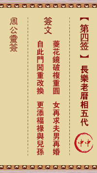 菱花破镜如何能够重圆,男女各有欲追求的姻缘;此后将有一番新气象,惟再积德修善,功德更添福禄,并有助后代儿孙安康。)