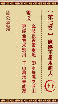 此签有”一念之差”之意。奉劝当事人,三思而行。一般人常对现状有所不满,或羡慕别人的际遇或地位环境,认为样样都比自己好,因此汲汲向外寻求,期望藉此获得另一片发展。人应珍惜现有的环境与资源,知福、惜福。谨记在做任何决定之前,务必慎重思量、仔细评估本身与环境的优弱势,找出最适合自己的定位与方向。切忌一时冲动负气出走,结果恐不如预期,既无法适应发挥所长,又藕断丝连、怀念原先熟悉的事物,将陷入进退两难、后悔莫及之境。