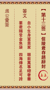 此签有”谦让未遑”之意。提醒当事人,施恩不求报。当有人向我们求助时,凡所当为,义不容辞。如果抱着希望对方回报的预期心理,就失去了原本为善的美意。须知”有心的功德不是真功德”。助人的根本意义,在于无心且单纯地去做,解决了问题之后,心里的快乐,绝非外在的有形物质可比拟。切勿期待对方有所表示、或因此窃喜念念不忘。相反地,如果自己受到帮助,即使是小小的恩惠,也要谨记在心、不可或忘,有机会立即加以报答。谨记施比受更有福,为善不足挂齿。
