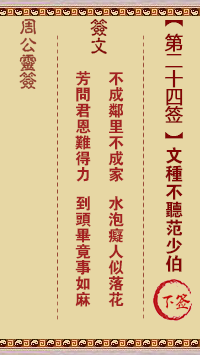 此签有”执迷不悟”之意。奉劝当事人,须知忠言必逆耳。看事情的角度不能光凭表面,必须多用点心,观察入微、从里到外,仔细分析评估求证。不要先入为主就认定一件事必定是如此。须知事事无绝对,很多事都有意外。对于他人的善意提醒与规劝,尤其在亲朋好友方面,应思考必定有其道理,要能谦虚接受、谨记在心。切勿亳不在乎地当成耳边风,免得吃亏在眼前,后悔莫及。