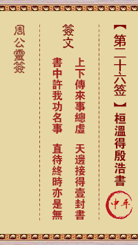 此签有”误会一场”之意。奉劝当事人,凡事洞察真相。人与人相处,很容易因为对方的无心之过而造成彼此间的嫌隙。须知在事情尚未明朗之前,不应道听涂说、人云亦云,或就此否定他人。眼见不一定为凭,耳朵听到的是非也不见得是真。应保持内心的清明理智,实事求是。切忌只看表面就果断做下决定,否则很容易引起不必要的纠纷。若与人有误会,何妨自己先退一步,解释清楚、尽释前嫌。所谓”十年修得同船渡”,应当把握人与人之间相处的缘份,互相珍惜。