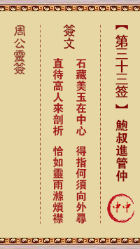 此签有”就事论事”之意。意味当事人,凡事不计前嫌。人与人相处,偶尔争吵与不快在所难免。但事过境迁之后,就无须仍耿耿于怀、记挂在心。应能不计前嫌,抛开自己心中的成见,就事论事、公私分明。对于他人的缺失,尽量包容体谅。凡事宽容以对,心胸将更为开阔。