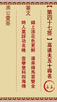 本签者。福禄双全之象者。凡事兴隆大吉之签。曰锦上添花色更鲜。运来之时也喜双全。八十二对大魁。不是晚也。奉献社会人群。积吾德。荫子孙。何乐不为。为天数之所赐。宜再积德。方有同点灯之故。易言之。儿有双亲。守时待庆遂平生志。都来自命。