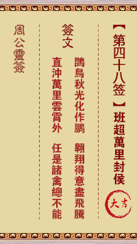 本签为?乌化鹏之吉象也。凡事皆能兴隆大吉。功名成之。利得之。婚合之。六畜旺之。六甲全之。官事。等等。无一不顺利也。直冲云霄之外。无可与伦比者。惟逢此佳境。勿忘今之所由成。积德。布施之再行者。可维护君尔之谋望无疑。易言之。今之君也。桂花时节财禄成此。