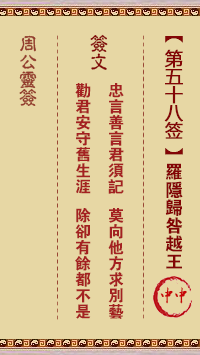 此签有”虚心求教”之意。告诫当事人,勿恃才傲物。有些人因为本身才气纵横而自视甚高,因此目空一切,对于身边的人事物,也常看不上眼,甚至语多讥讽、一派自以为是,非不得已,决不向他人求教。须知过于刚硬的个性会带给别人不悦的感受而容易导致处处碰壁,如果能够正视并收敛此种狂放自傲的个性,凡事虚心下问,加上本身的才华与能力,相信成就一定不只于此。对于身边亲朋好友的劝告,务必听进心里去,想一想别人为什么这么说。