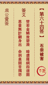 本签者。暗遭罗网四边围之命者。凡事必须提防歹人陷害。此运者起跌不常者。且虚。险。惊。改。凶之者多。经多方面涉尘。终能出险。惟此历程艰苦异常。无以数计。思量无计翻身出。易言之。身居尘内祸自天来。早须防备免受其灾。