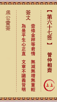 本签之曰。心中端正之象。凡事能平稳大吉之者。一条金?等君情。由它衡量即是无减无增。无重轻为人之道。即是人心平生心正直之时。即使不识文章也明白义之道理。易言之。平生正直善处人情只依本分天下则太平矣。清高门路即可。