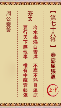 此签有”人外有人”之意。提醒当事人,凡事谨言慎行。有时我们自以为什么都知道,尤其是对现状驾轻就熟的时候,很容易不自觉的自满或松懈下来,言行举止也在不知不觉中变得傲慢无礼。但所谓”一山还有一山高”,须知天下之大,比我们见多识广的人一定多如牛毛、密如过江之鲫。因此切忌自以为是、咄咄逼人,在自身状况良好的时候,也别忘了提醒自己:”强中仍有强中手”。勿过于松懈,仍应时刻充实自我,发现有不足的地方,就要想办法弥补。凡事谦冲忍让,莫逞一时口舌之争。