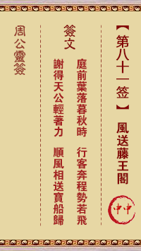 本签也。从心所望之象也。凡事大吉利者。一叶如秋后。逐渐有机缘。行客之来势如飞奔。风送君尔之船。只要轻轻着力??即将宝藏船舶推送回来。不必费力者。此者非人力之所逮。易言之。心中所望天必从之所谋用事尽可施为。