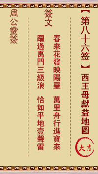 本签者。帝朝受职之象。凡百事兴者遇贵则吉利者也。春来花发。是百花争妍斗艳之刻。万里舟行进宝来其声声之旺也。如跃过禹门三级浪。恰如平地一声雷响起者。易言之。帝朝受职如贫得宝望用从心签中第一。