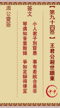 此签有”争不如静”之意。提醒当事人,凡事耐性。每个人都有自己的一套看法与想法,有时难免与人意见相左。然而公说公有理、婆说婆有理,有时与其争论激辩,不如保持缄默。即使别人有误解、不了解,又何必放在心上,只要心中清亮,知道自己在做什么就好,实在无须在意别人怎么看、怎么说。