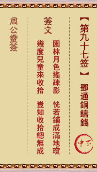 富贵在天,贫穷由命,不用机谋,皆有分定。此签虚名薄利之象,凡事不宜贪求。
