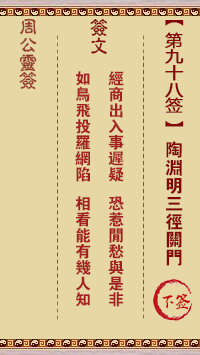 本签者。禽遭罗网之象。凡百事守旧可获安者。诗曰。经商出入事迟疑。也因此惹闲愁。不必要之愁争。听了是是非非。谣言四播。逢遇如此罗网苦境中。必须多修福。积德方能脱离险境者耶。易言之。君之今也。禽遭罗网有理难分。随缘守旧遇贵乃成之命耶。