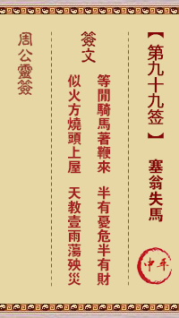 本签示之于弟子曰。凶危有财之象。凡事凶后吉耶。等闲骑马着鞭来。半有忧危半有财。似火方烧头上屋。正受灾殃之刻。一场大雨来了之后。方可将灾厄洗清而去。目下虽事难成。劳心劳力之后。必有转安之时。易言之。君汝也。知如不知不管是非身临枷锁恩赦放归。