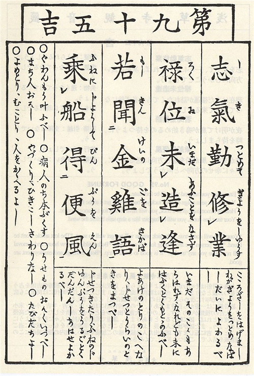 立定志向,如果一心努力的话,渐渐地会朝向好的方向吧。现在就算福运还没到来,必定之后会到来吧。就像等待着黑夜放明,鸡开始啼叫般地,等待时机的到来吧。时机到来、就像风把船推向前进的方向般地,渐渐地朝向幸福的方向吧。